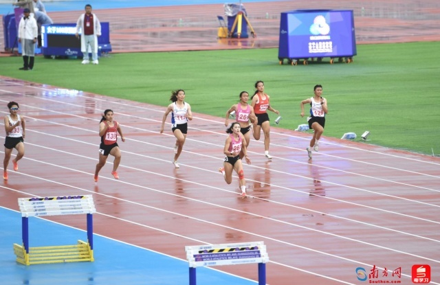 在女子400米跨栏比赛中,位于第五道的270号选手莫家蝶以59秒13的成绩夺得冠军。莫家蝶是上一届全运会女子400米跨栏项目的冠军,这次的全运会,作为卫冕冠军的她更是信心满满,尽管这是一场测试赛,但莫家蝶也是全力以赴,用每一次交替迈步丈量十五运会的场地。